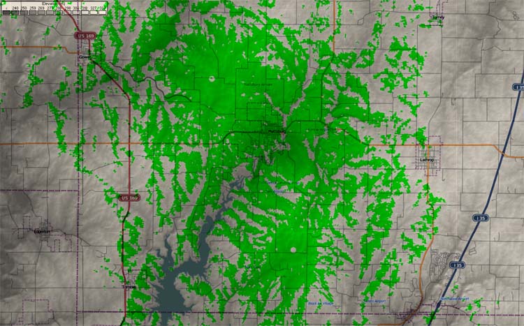 As you can see, low areas and areas beyond hills will need a tower to receive signal.